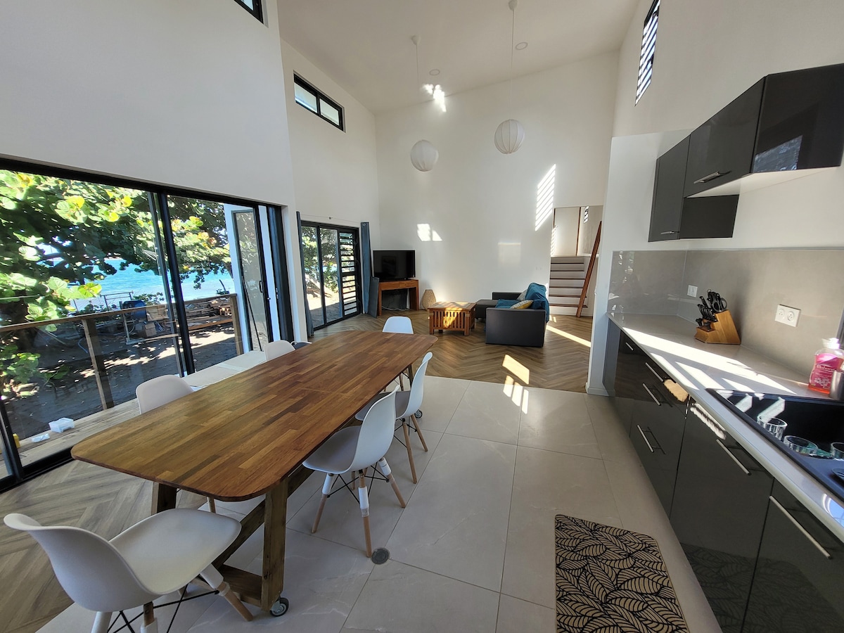 80 m2-es szállás, terasszal, fedélzettel és 200 m2-es kerttel a tengerparton, kilátással MOOREA-ra. Összetétel: - egy nagy családi konyha minden szükséges felszereléssel egy gyönyörű 6 személyes faasztal körül, - egy szomszédos nappali teraszra nyíló ablakkal - egy függönnyel elválasztott hálószoba két egyszemélyes ággyal, - végül egy fő hálószoba king méretű ággyal (1,80x2m) és fürdőszobával, zuhanyzóval és WC-vel. Tökéletes hely kis családoknak két gyerekkel.