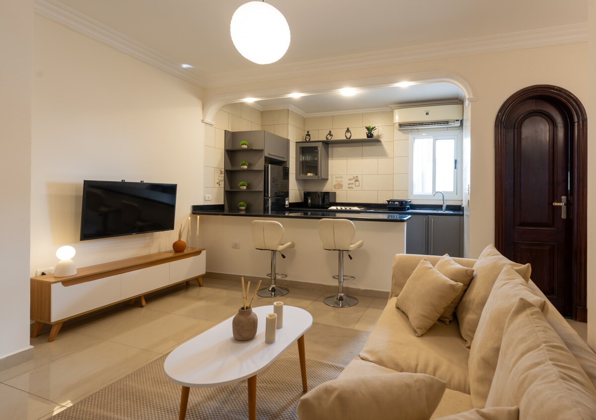 Üdvözöl a stílusos kiruccanásod Zamalek szívében teljesen berendezett lakás a tökéletes kairói tartózkodáshoz. • 2 hálószoba: • Hálószoba saját fürdőszobával és eszpresszó kávészobával • Második modern hálószoba • 2 fürdőszoba • 2 tágas nappali Teljesen felszerelt konyha Jelszavas kulcsszéf A 9. emeleten található, lenyűgöző kilátással Zamalekre és a kairói toronyra. A Saudi szupermarket felett, kávézók, éttermek és minden alapvető dolog közelében. Tökéletes rövid távú foglalásokhoz vagy üzleti utazásokhoz.