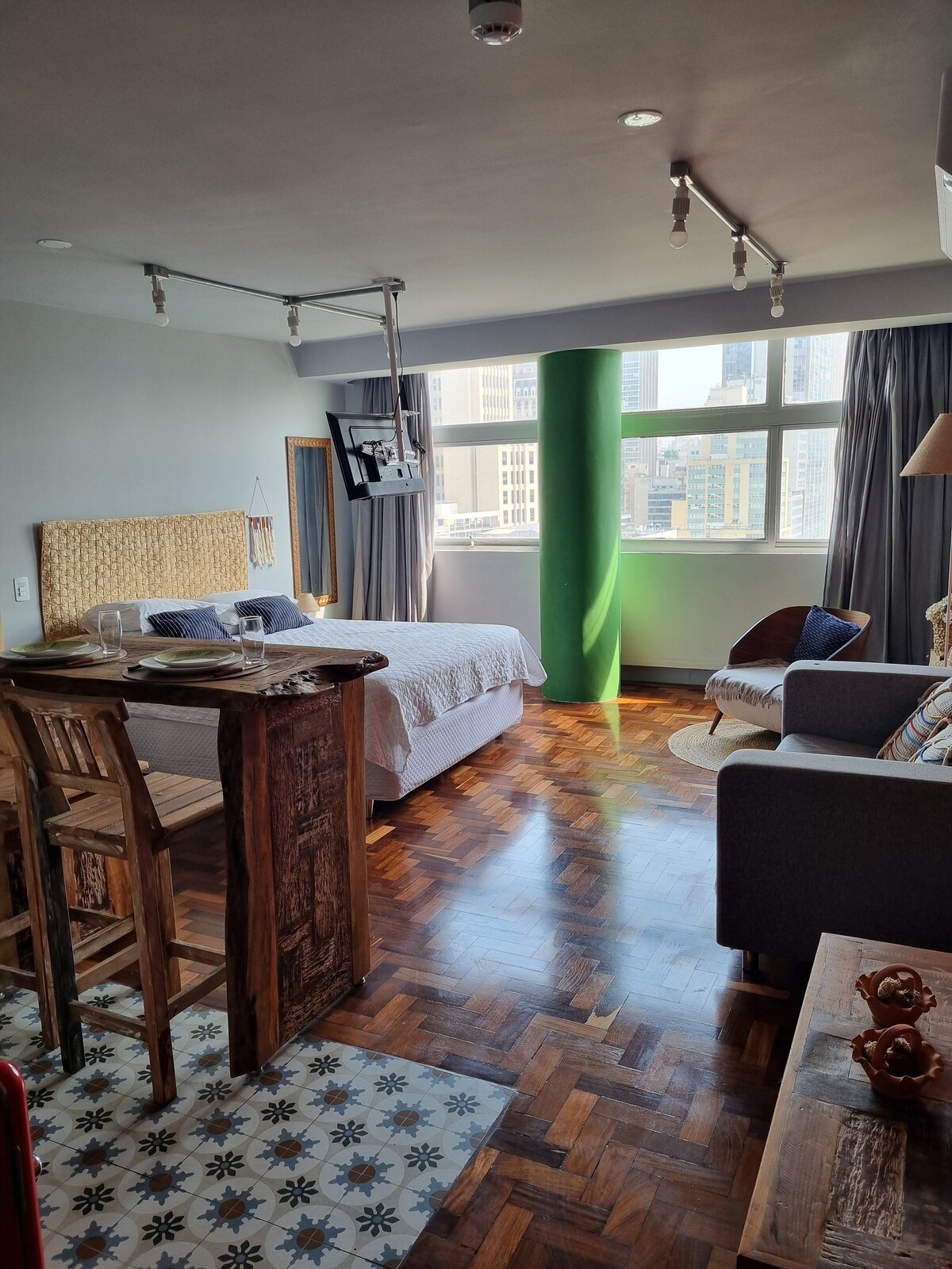 35 m²-es ipari stílusú stúdió a 39. emeleten, panorámás kilátással az Anhangabaú-völgyre. Modern környezet betonnal, szabadon hagyott téglával, fával, fémmel és Caio Fonseca exkluzív falfestményével, amely identitást és hitelességet kölcsönöz a térnek. Közel a bárokhoz, éttermekhez, a Republic gasztronómiai útvonalához, népszerű üzletekhez és színházakhoz/múzeumok/központokhoz. Ideális pároknak, fotósoknak és digitális nomádoknak, akik kényelmet és stílust keresnek São Paulo belvárosában.