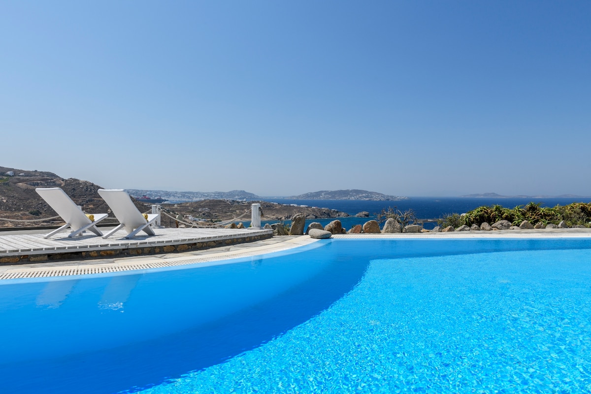 Villa Mystique magasan a dombok felett a legszebb panorámás helyen, kilátással a végtelen kék a horizonton. Delos, Rhenia és más, a láthatáron szórt szigetek látványos környezetet teremtenek a leginkább fotogén naplementéhez.