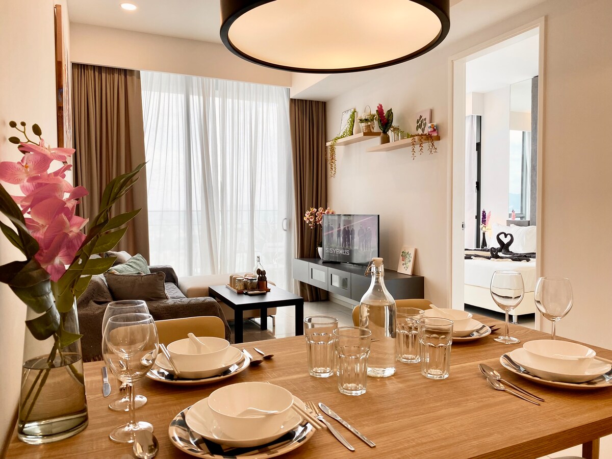 King Suite Home is 1 bedroom Apartment includes a full kitchen with refrigerator and microwave. These are family style suite with separated bedrooms, a living room and a dining area. Complimentary unlimited Wifi, TV, iron&board, hair dryer, laundry washer and dryer. This King Suite Home is a AIRBNB friendly apartment and accessible to enjoy many condo facilities. Comfortable, in style living area fitted with nice Sofa bed and coffee table. Separate room with Queen bed and 4-seater dining table.