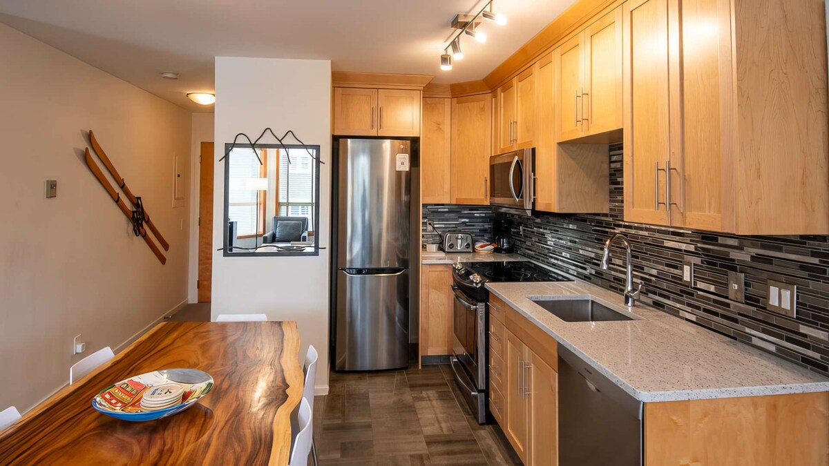 This unit offers panoramic views of the Fernie alpine resort and the neighboring mountains and green scape. The open-plan living makes it a perfect space to enjoy with family and friends. With the ski lifts and bike trails just a short walk away, you can relax in the morning and come back for lunch if you want! Within the complex you can find multiple outdoor hot tubs, games’ rooms, and a sauna. For food, dining, and entertainment Fernie's historic downtown is just an 8-minute drive away.