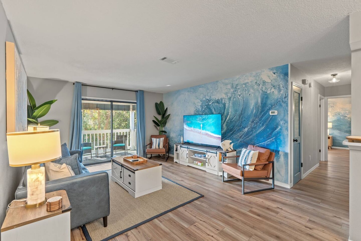 Tengerparti témájú, 2 hálószobás, 2 fürdőszobás lakás központi helyen, a 9. sugárút és a Davis Hwy között, Pensacolában – 3783 E Olive Rd. Tágas, nyitott elrendezésű lakás nagy nappalival, étkezővel és teljesen átalakított konyhával (2026). Vinilpadló az egész otthonban. Minden új fürdőszoba egyedi csempézett zuhanyzóval. Mosógép és szárítógép az egységben. Két tágas hálószoba king és queen méretű ággyal. Terasz a konyha mellett. Ingyenes parkolás a helyszínen.