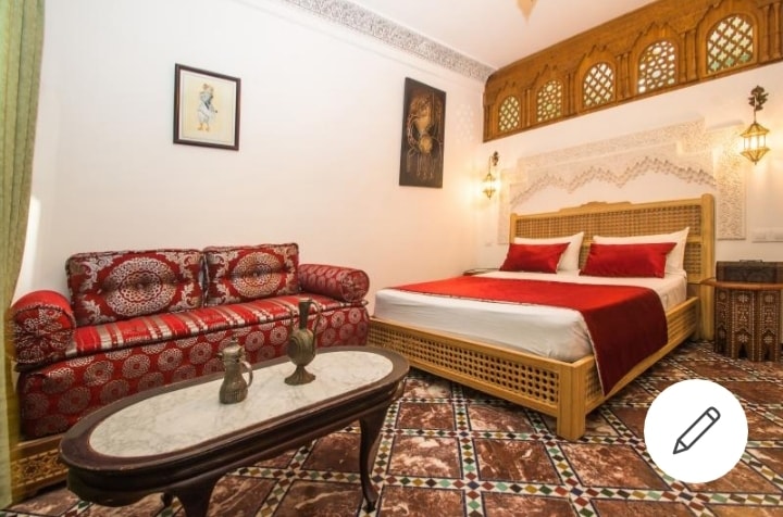 Egy nagy, háromágyas/négyágyas szoba egy hagyományos házban Fes medinajának szívében. A szoba a földszinten található, és saját fürdőszobával és külön zuhanyzóval rendelkezik. Légkondicionálás. Babaágy felár nélkül biztosítható. 2 szabványos egyszemélyes ágy és 1 standard franciaágy áll rendelkezésre.