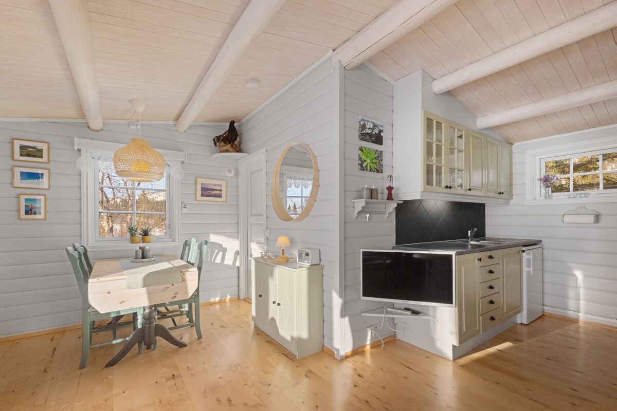 Lys og moderne hytte. Nyoppført i 2018. Spotter i tak, kjøleskap, oppvaskmaskin, komfyr og stekeplater. Spisebord med plass til 6 stk. Kabel-tv og sofa. Flislagt bad med regnfallsdusj. 2 soverom med dobbeltseng pluss hems med plass til 2-3 stk. Utsikt mot fjell og hav. Terrasse med utemøbler og grill.