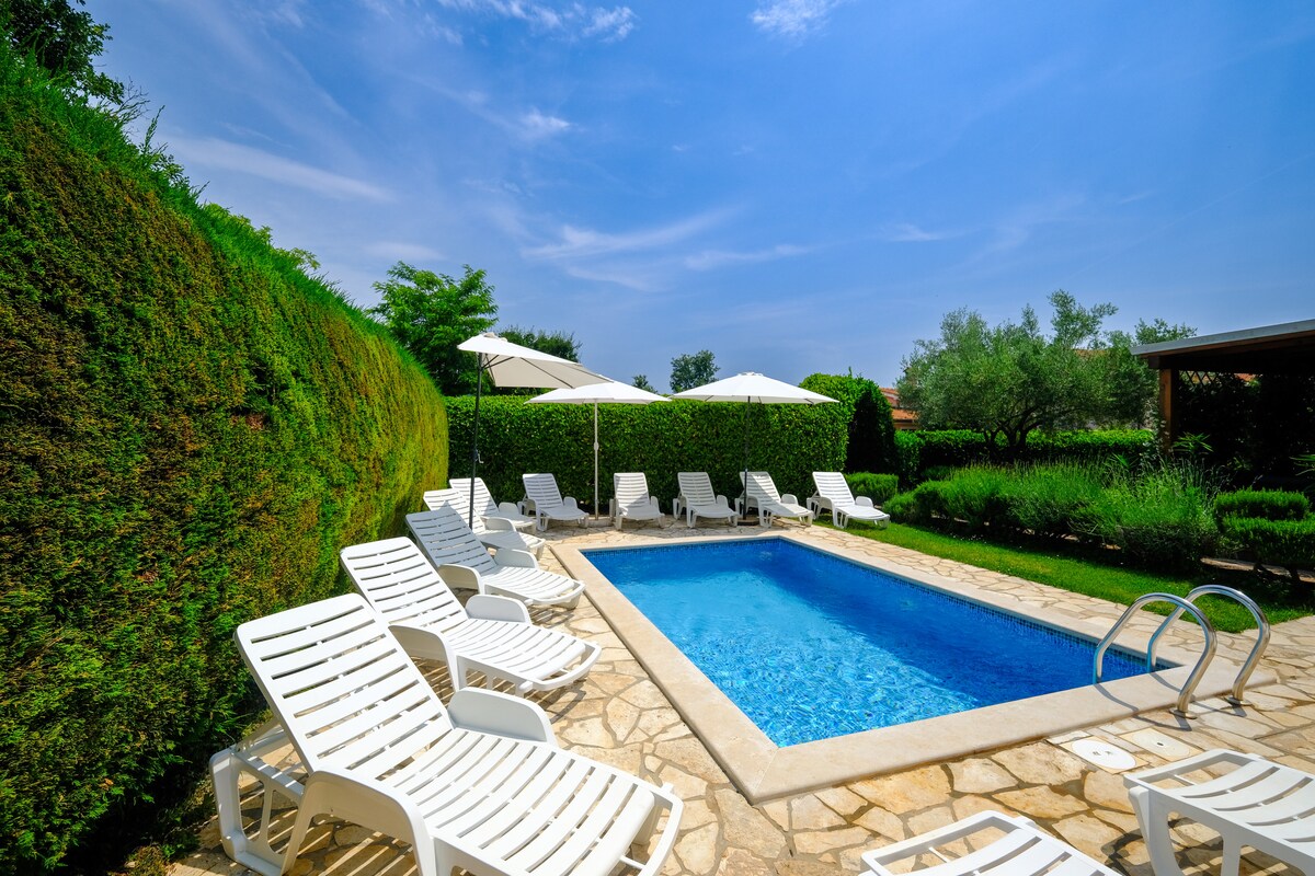 Welcome to our villa with a private heated swimming pool in the Istrian countryside, ideal for families or groups of friends of up to 6 people. Located in a small village surrounded by olive groves and vineyards, the house is only 5–10 minutes from several beaches. Strategically located to visit seaside towns such as Novigrad, Umag and Poreč, as well as charming inland villages like Buje, Brtonigla and Grožnjan. Istralandia aquapark is just minutes away. Book now for an unforgettable vacation!