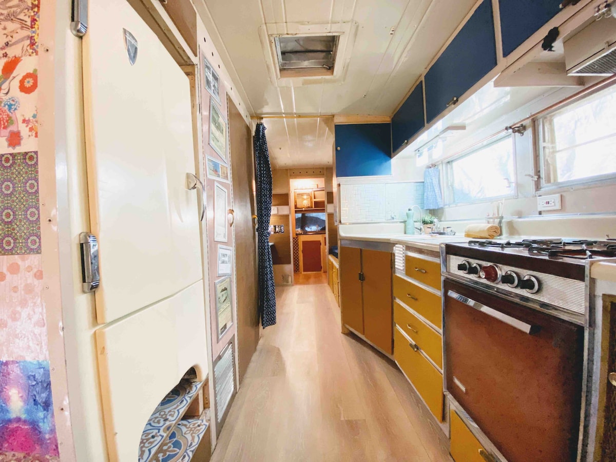 Holmes is a 1963 Streamline (Airstream-like) that has been given new life and awaits your stay! Freshly designed while preserving the original integrity that could be saved, this aluminum hunk of love has received a lot of care and attention! The eclectic design and colorful palette display a personal touch, while a comfy bed, full kitchen, and dedicated work/reading nook make Holmes a very functional camper! Just a ~3-minute stroll to swimming and relaxation at our Flathead Lake beach.