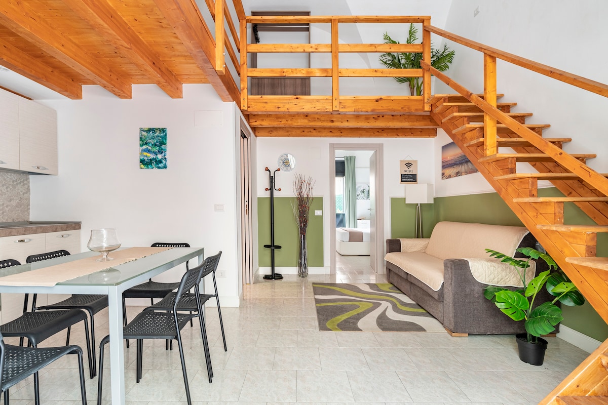 Al centro della città e dotato di ogni confort, l'open space offre un ambiente minimalista e contemporaneo. Le ampie vetrate permettono di godere della luce naturale e della vista del verde del parco cittadino, mentre il pavimento in parquet di bambù unisce armonicamente l'ambiente naturale esterno con l'interno dell'abitazione. L'atmosfera rilassante in ogni angolo dell'appartamento fa dimenticare di trovarsi in una centralissima via cittadina.