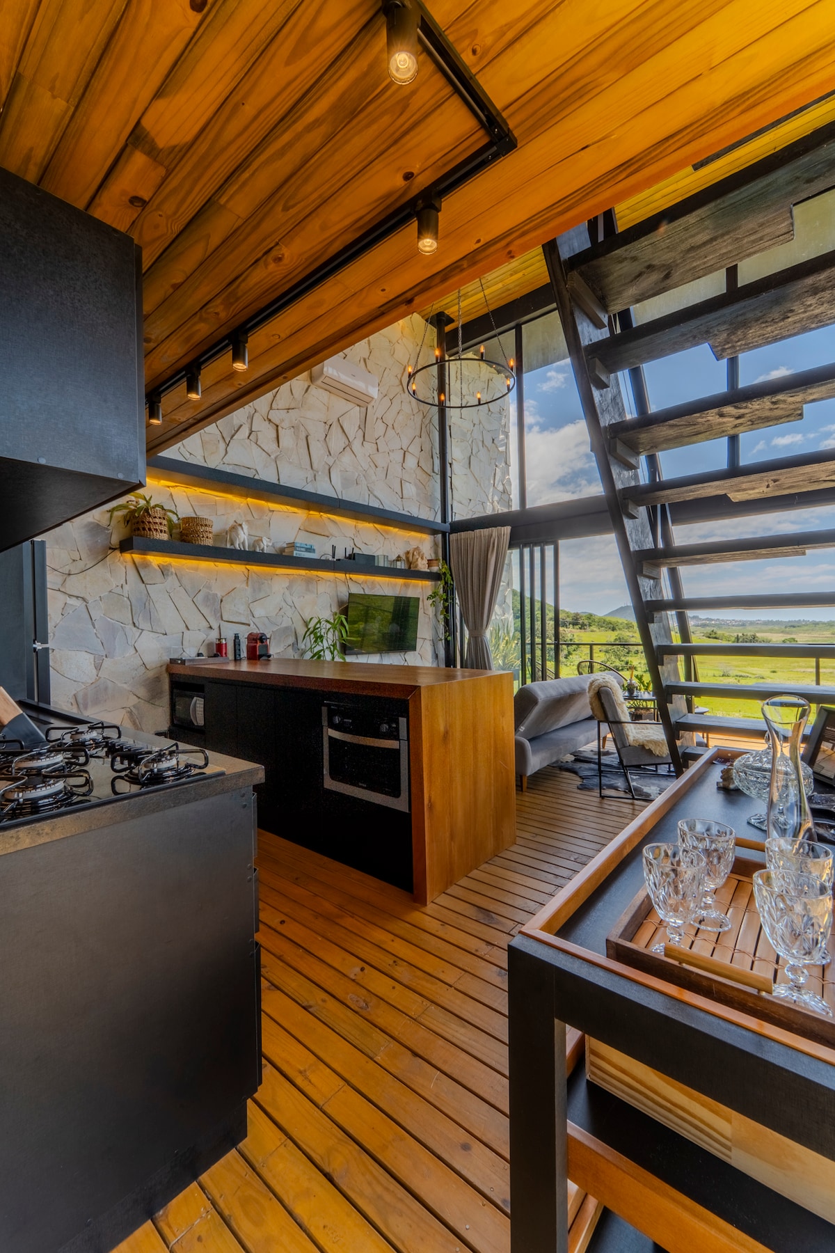 Sunrise Home - Meio do Nada Cabanas na Montanha É o tipo de lugar que não se explica, se sente. A 1037m de altitude, a cabana entrega uma vista 360° que hipnotiza e um silêncio que reseta a mente. O dia começa acima das nuvens, espetáculo particular só pra quem está aqui. O ofurô de madeira de 1000L, aquecido e com hidro, transforma a estadia em algo único. À noite, a lareira aquece o corpo, enquanto o céu estrelado rouba a cena. Sem vizinhos, sem pressa, sem filtros. Puro, raro, inesquecível.
