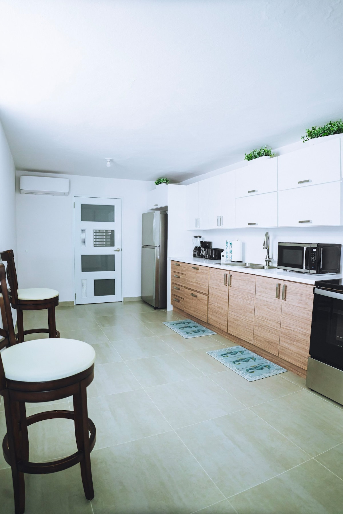 Our recently renovated Penthouse is setup with 2 queen size beds, has a full kitchen combined with living/dining, & a bathroom. The side doors open to a spacious patio. Its only a 7-10 minute walk to the Malecon (the main tourist strip) in Esperanza and is close to the Green Store so you can pick up supplies. We have the fastest wifi that we could get on the island, so guests can stay connected. Tropical gardens on first floor with a mango tree. Brand-new, upgraded Air Conditioner in this unit!