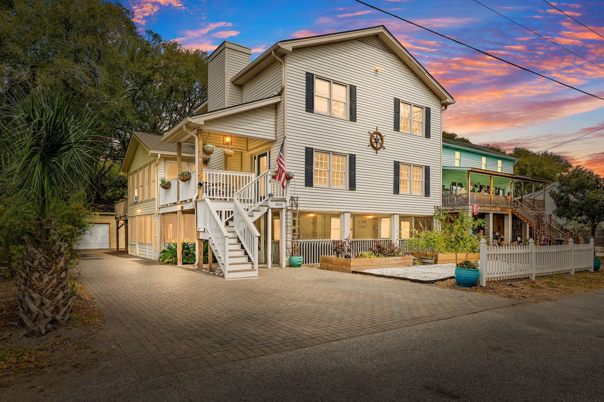 FollyTude is a pet‑friendly 3BR + Bunk Rm/2.5BA beach house sleeps 8 across from beach with full‑length deck & prime ocean views 7 blocks from downtown Folly. Enjoy an open floor plan with cozy living room-sun porch, dining area & kitchen island. Beach‑cottage decor throughout, comfy King, Queen & Twin beds with luxe linens create sensational seaside slumber. The back screened porch has a washer/dryer+refr. Yard is perfect for kids & pups to play. Pirates Cove playground just 4 blocks away.