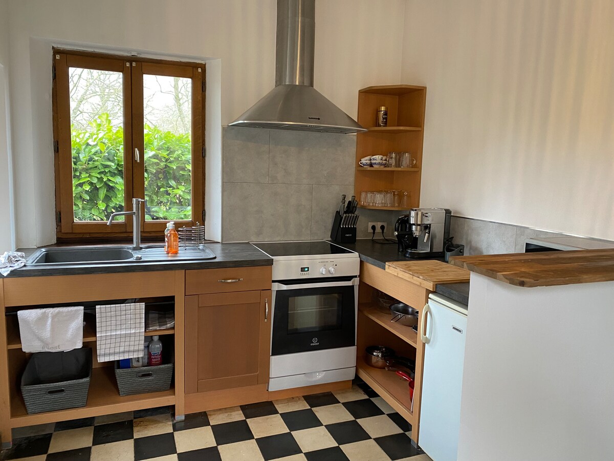 Charmant four à pain ancien en colombages, situé en bord de ruisseau il se compose de : - Salon avec un poêle à bois, - Cuisine, - A l’étage : -salle de douche/WC accessible par une échelle de meunier (voir photos), -chambre avec un lit 160x200 avec vue sur le ruisseau, accessible par une échelle de meunier (voir photos), Chambre et salle de bain ne communiquent pas. Salon de jardin, BBQ, parking privé, bois de chauffage inclus Note autre gite, la Maison de pierres, est à 100m