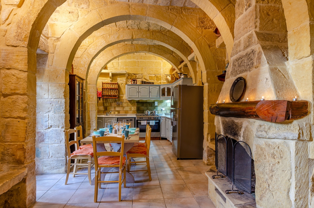Come relive Gozo’s traditional way of life at this authentic house situated in the charming Gozo hamlet called Munxar. This house has been meticulously renovated from a 200 year old farm into a magnificent holiday house with modern amenities and private pool. The architecture has traditional farmhouse characteristics with many charming stone features. What was originally the mill room is now the living room with sofas and a fireplace for our winter visitors.