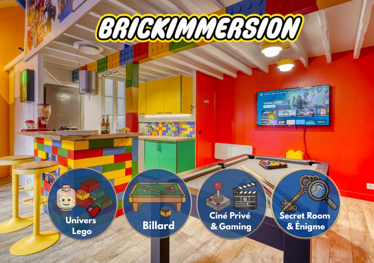 Fini les hôtels sans âme. ✨ BrickImmersion 🧱, c'est l'expérience immersive que vos amis ne croiront pas tant qu'ils ne l'auront pas vécue. Cinéma privé 4K, billard pro, univers inspiré de la célèbre brique LEGO & quelque chose d'autre. Un passage secret vous attend. Un niveau qui se mérite. Saurez-vous trouver le mécanisme secret vers le Niveau Supérieur ? 🔐 Geeks, curieux, cinéphiles ou gamers : votre setup idéal, complet & exclusif vous attend. 📍 Paris · 25 min | Fontainebleau · 10 min 🕹️