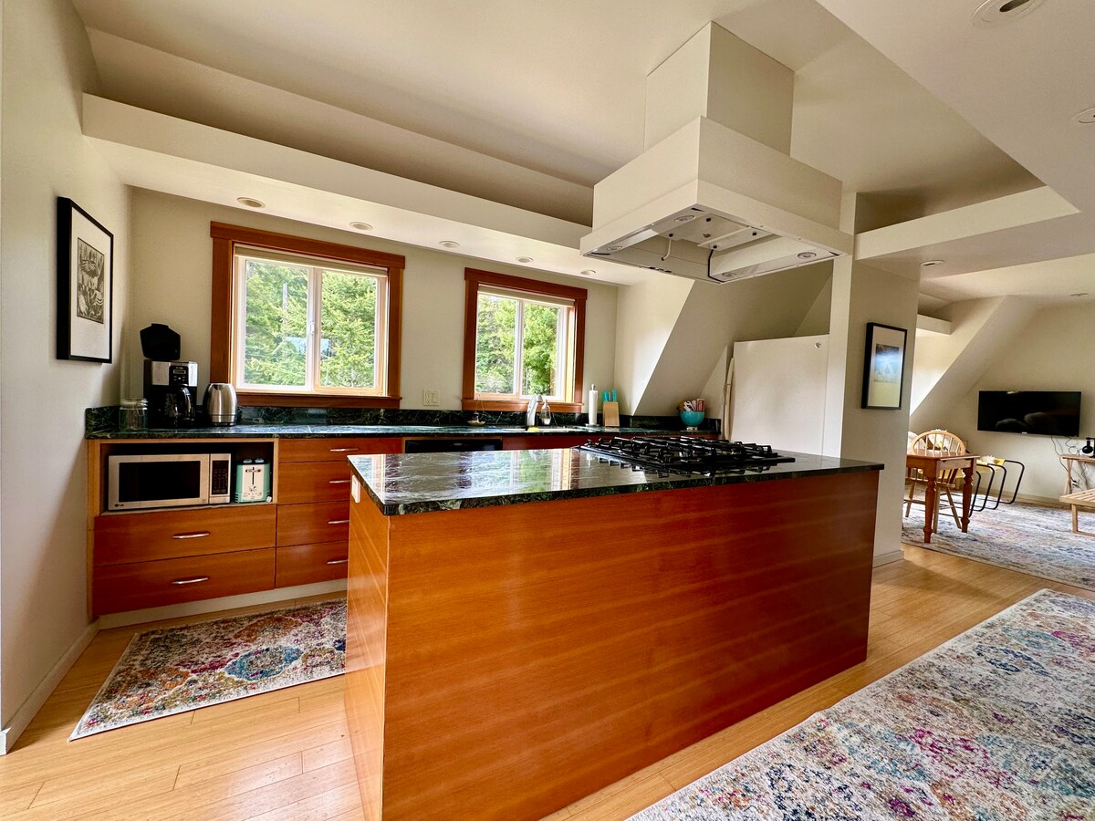 Lounge in this MCM inspired A-Frame cabin surrounding by towering redwoods. A Jackson State Forest szélén található, mégis kényelmesen, Fort Bragg belvárosától és a Noyo Harbortól mindössze 7 percre található. Egy nagy, déli fekvésű teraszon lazíthatsz, és hozzáférhetsz egy kézzel készített cédrus pezsgőfürdőhöz és grillezőhöz. Belül egy süllyesztett nappali, kandalló, nagy beépített kanapé, 2 hálószoba, bakelitlemez-lejátszó és sok minden más található. Tökéletes egy pár kiruccanásához, egyedül utazáshoz vagy kis családhoz.