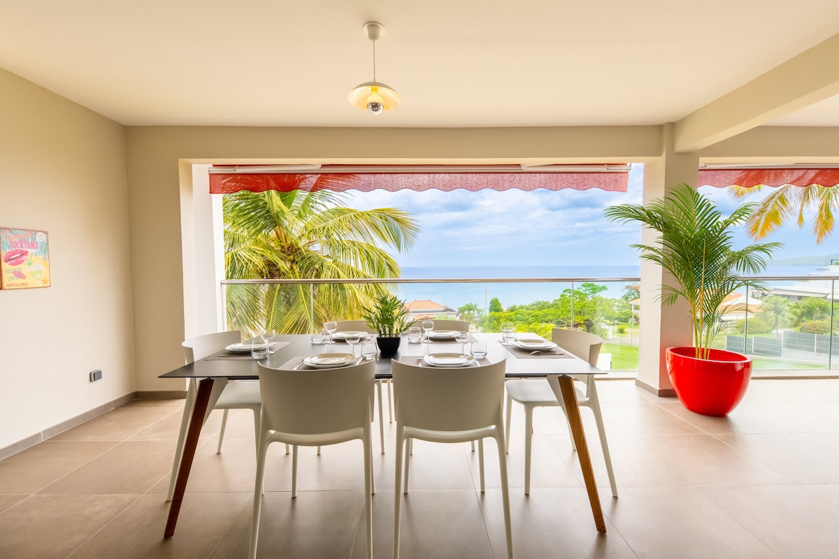 Profitez d'un logement neuf de 140 m2 décoré avec goût, disposant de 3 chambres spacieuses avec lit king et d'une grande terrasse couverte de 30m2 avec une très belle vue sur la mer des Caraibes. Idéal pour passer des vacances ou pour travailler, l'appartement dispose d'une très bonne connection wifi par fibre. Il est situé au centre de la Martinique, à la fois proche de la mer et des plages mais aussi proches des zones économiques et des commerces.