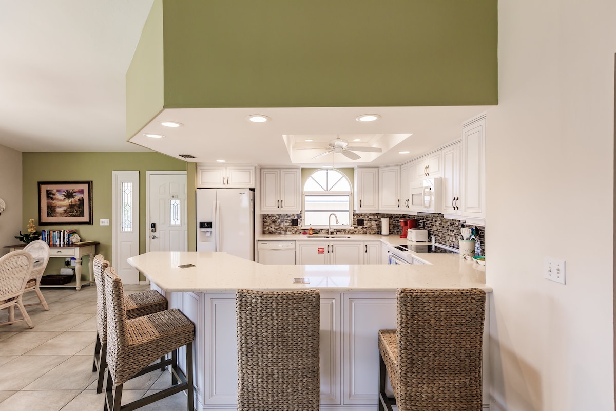 Gyönyörű 3 hálószobás, 3 fürdőszobás otthon egy dokkkal rendelkező csatornán! Hozd a hajódat vagy a jet-skit! Élvezd a pihentető tartózkodást, és figyeld a delfineket és a lamantinokat közvetlenül a dokknál. Ebben a gyönyörűen felújított otthonban minden megtalálható, amire szükséged lehet egy fantasztikus nyaraláshoz. Különösen elhelyezkedés! 5 percre Ft Meyers Beach-től. Élvezd az üdülőhelyet közvetlenül a saját kertedben. Új medence pezsgőfürdővel és napozó polccal. Élvezd a gyönyörű naplementéket a hatalmas teraszon. Trolly to beach at neighborhood entrance or walk to minutes.