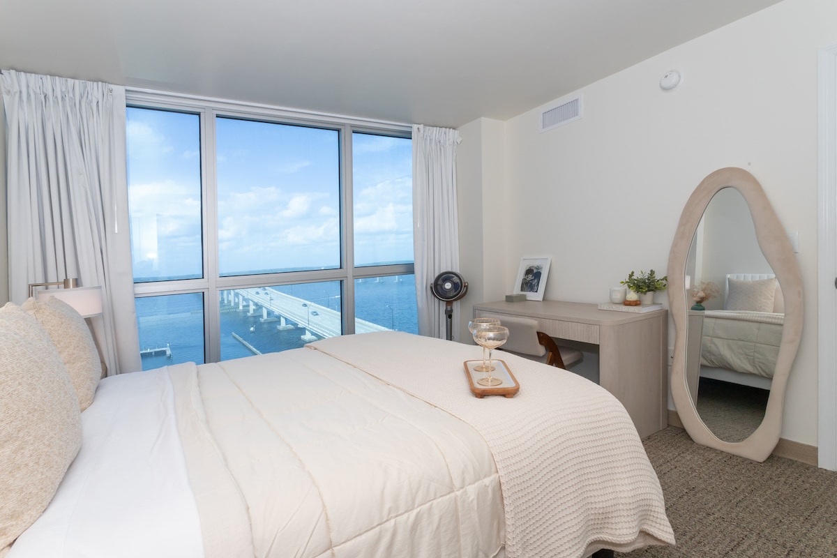 Wake up to stunning river views and glowing Florida sunsets from this elegant 10th-floor waterfront condo. Designed for comfort and relaxation, the retreat features a private bedroom with a queen-size bed, 1.5 bathrooms, a folding full-size bed, and a cozy sofa, comfortably hosting up to four guests. Enjoy resort-style amenities including a pool, spa, fitness center, private cinema, game rooms, beach gear, and a lobby café with optional room service, just steps from downtown Fort Myers.