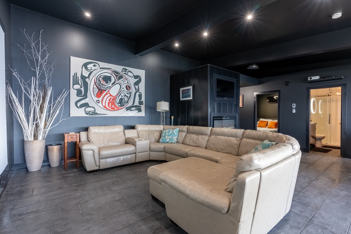 Privát menedék az erdővel körülvett hektáron, ahonnan kilátás nyílik a Currie-hegyre. A lakosztály délre, a ház alsó szintjén található, saját kocsifelhajtóval és bejárattal rendelkezik. A dekoráció rusztikus, de modern, és sok természetes fény éri, így nyáron hűvös és szellős, télen pedig otthonos a tűz mellett. A szórakozás magában foglalja a színházat 85hüvelykes 4K tévével + 7,1-es kör, a PS5 (1 távirányító), a pattogatott kukoricát, a buborékhokit, a biliárdokat, a játékokat, a szaunát és az 5 személyes pezsgőfürdőt. Whistler 45 percnyire található. IG: @OwlRidgeLodge