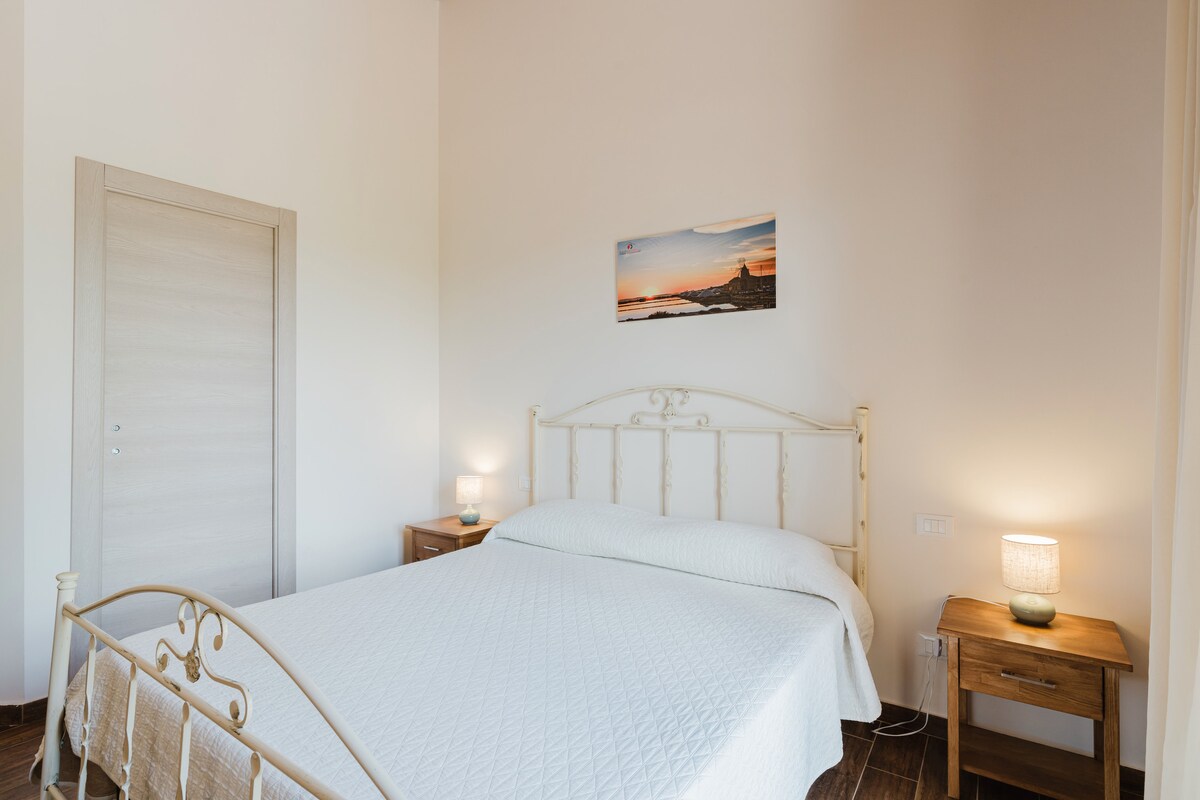 Located in Marsala, the 'Scirocco' room is situated on the ground floor of an apartment, ideal for up to 2 guests. You have a bedroom with a double bed and a private bathroom, ensuring comfort and privacy. The fully equipped shared kitchen allows you to prepare your own meals. Amenities include private air conditioning, TV, Wi-Fi suitable for video calls, and a dedicated workspace. A cot is available on request, and a bicycle can be provided for exploring the area.