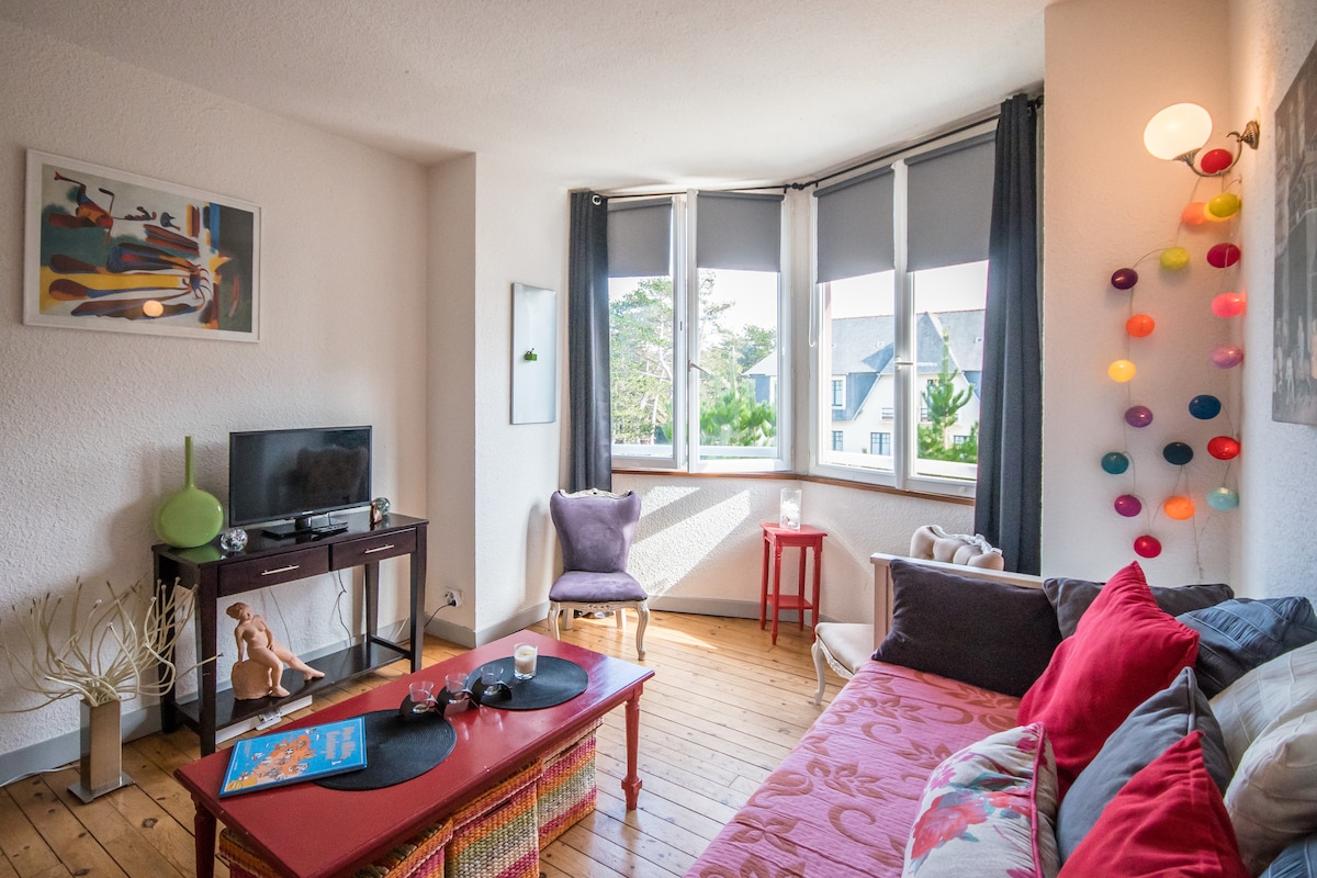A Les Sables d 'Or les Pins tengerparti üdülőhely szívében, közel a hatalmas homokos strandhoz és dűnéihez, Bretagne egyik legszebb, bájos, teljesen felszerelt stúdiójában, egy stílusos épület második emeletén. Az év során a Les Sables-d 'Or-Les-Pins séta garantálja a varázslatos áttörést. A Saint-Brieuc öböl szívében, a Cap Fréhel közelében fekvő üdülőhely ideális kiindulópont a szárazföldi és tengeri sétákhoz.