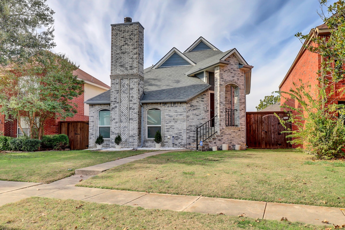 Élvezze a stílusos, központi fekvésű házat a Grandscapes szabadtéri bevásárlóközpont közelében. 3 hálószobás, 2 fürdőszobás, 2 fűtéses mosdó/szárítógéppel, teljesen felszerelt konyhával, étkezősarokkal, 65"-os okos TV-vel a hálószobában, ingyenes nagy sebességű Wi-Fi-vel, 55"-os okos TV-vel a hálószobában, a Grandscapes, Dallas északi és középső része, a Dallas Parkway, az American Airlines Center (Dallas Mavs és Stars), a HOF focicsapat, az MLS FC Dallas, a Frisco Rough Riders és számos modern lakás közelében.Parkok, Hawaiian Waters Waterpark, Top Golf, előkelő üzletek és éttermek a közelben. Ez drive az arlingtoni szórakozónegyedbe. 1000 dolláros díj a szabályok megsértéséért