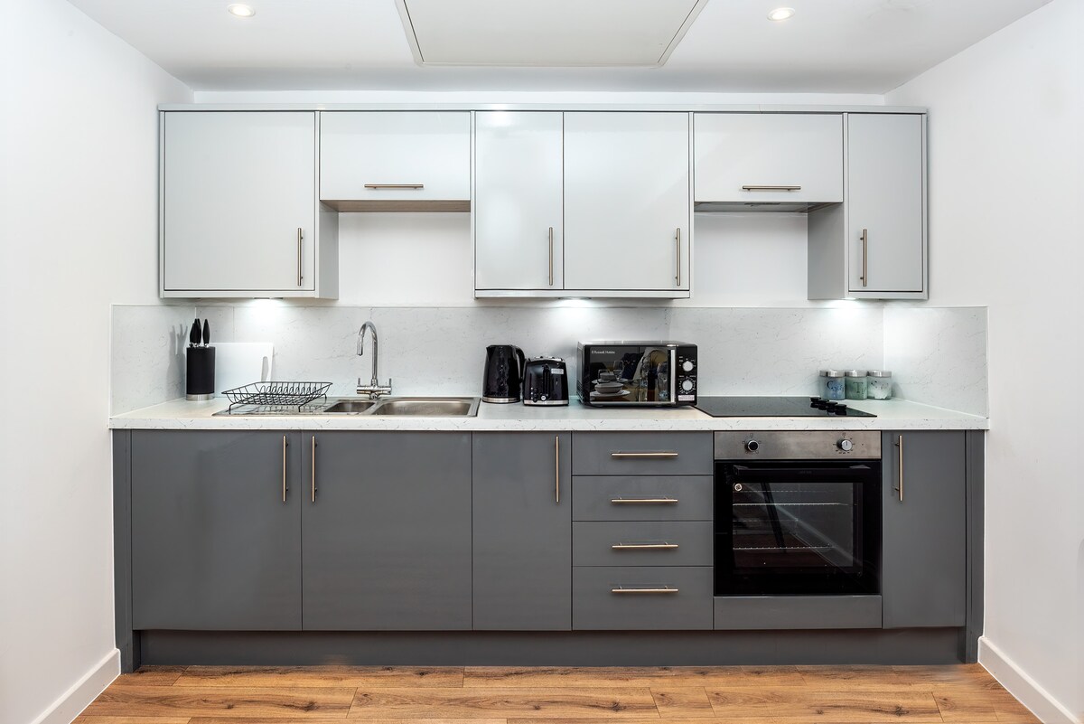 Our new stunning studio apartment in Preston City centre has a king size bed . A comfortable seating area with a large screen smart TV. The kitchen has a fridge, oven, hob,kettle,toaster and microwave. We provide complementary tea,coffee sugar cereal and fresh milk on arrival. A smart shower room with toilet and wash basin and illuminated mirror. Just 20 yards from the new ANIMATE entertainment complex.Reserved parking next to the apartment is included