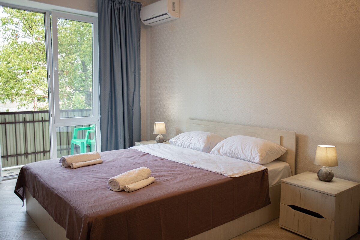Világos és hangulatos szoba egy vendégházban, mindössze 600 méterre a festői Fekete-tengertől. A szoba mindennel fel van szerelve, amire szükséged lehet a kényelmes tartózkodáshoz: kényelmes bútorok, légkondicionálás, Wi-Fi és friss felújítás. A vendégház területe jól karbantartott, van egy hangulatos hely a szabadtéri kikapcsolódáshoz. A ház közelében üzletek, kávézók és egy tömegközlekedési megálló található, ami a lehető legkényelmesebbé teszi a tartózkodást. Nagyszerű hely családi vakációhoz vagy barátokkal való utazáshoz!