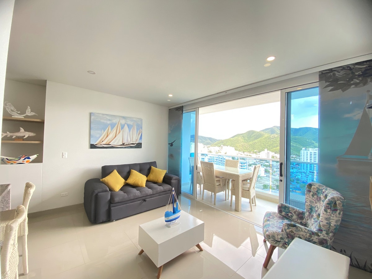 Fényűző lakás Playa Salguero de Santa Martában, modern dekoráció, tágas terek, 2 hálószoba, 2 fürdőszoba zuhanyzóval, légkondicionálás mindkét szobában, úszómedencék felnőtteknek és gyermekeknek, közvetlen hozzáférés a strandra, félig privát strand étkezési és italfogyasztási lehetőséggel, gyönyörű közös terek. 15. emelet felülmúlhatatlan kilátással a Sierra-re. 2 db kétszemélyes ágy, 2 db egyszemélyes ágy és 1 db kanapéágy. Teljesen felszerelt konyha. Parkoló. Wifi. RNT-71000
