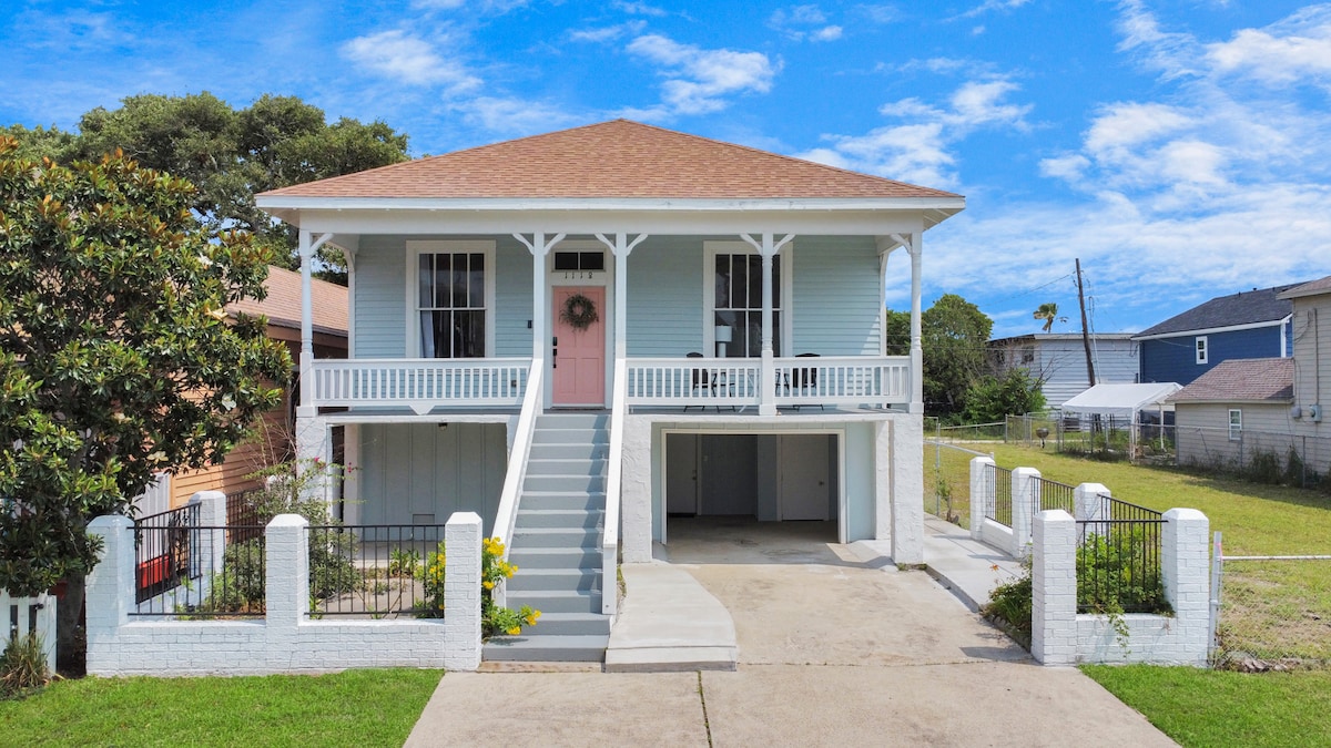 Butterbee Hideaway - közvetlenül a felvonulási útvonal mellett a 25. utca mentén a Mardi Gras felé, de mégis csendes központod egy nagyszerű galvestoni nyaraláshoz! Kis történelmi otthon nagy ablakokkal, színes falakkal és válogatott dekorációval, ha pihenni szeretnél, és központi helyen, ahonnan könnyen eljuthatsz éttermekhez, bárokhoz, felvonulásokhoz és látnivalókhoz.
