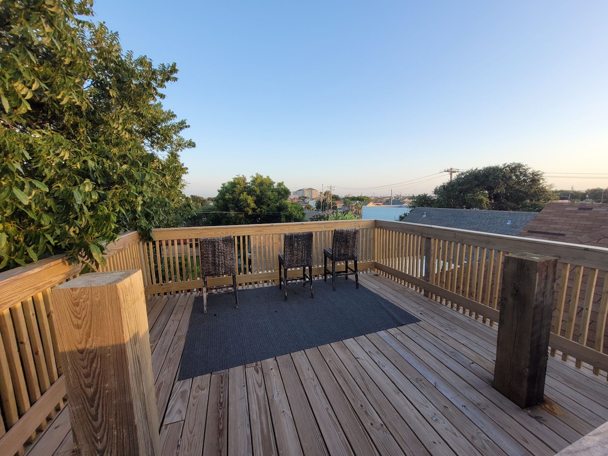 Családbarát hely a hétvégék eltöltéséhez az öbölben. Három háztömbnyire a strandtól/Murdoch's-tól, két háztömbnyire a Bryan Museumtól, 15 perc sétára a Strandtól. 1200 négyzetméteres, 1908-as ikerház gyönyörűen felújítva, számos eredeti jellemzővel, amely visszarepít Galveston régi szép napjaiba. Élvezd a sziget mindkét oldalára nyíló kilátást a tágas tetőteraszról. Biztonságos parkolás a helyszínen. Vedd figyelembe, hogy ez a szálláshelyen található három egység egyike. Van egy kiszolgáló egységünk a földszinten és egy inlaws egységünk