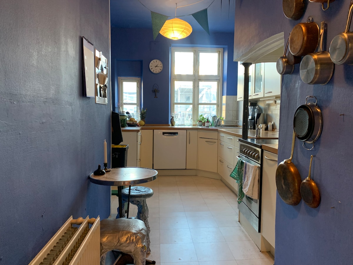Üdvözöllek az otthonomban. Őrült hangulatú, 78 m2-es lakás Nørrebro szívében, egy csendes utcában, mindössze néhány perc sétára a Sankt Hans Torvtól és a csodálatos Assistens temetőtől. Tömegközlekedés a közelben - 30 percre a repülőtértől. A lakásban egy hatalmas konyha/étkező található mosogatógéppel és sztereóval, társalgó átalakítható kanapéval/ággyal és egy kétszemélyes hálószobával. Projektorvászon, lemezjátszó, régiségekkel és DK dizájnnal berendezve. Mosoda az alagsorban (ingyenes).