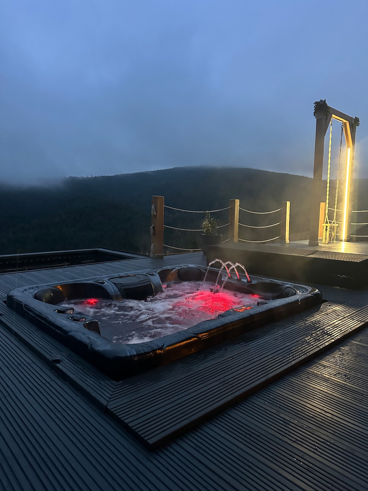 Premium Mountain-Top Retreat in the Apuseni Discover an exclusive cabin set on a secluded mountaintop in the Apuseni, where design, comfort, and breathtaking scenery come together. This stylish retreat features a generous private deck with an outdoor hot tub, refined interiors, and panoramic views in every direction. Perfect for guests seeking luxury, tranquility, and an unforgettable escape above the clouds.