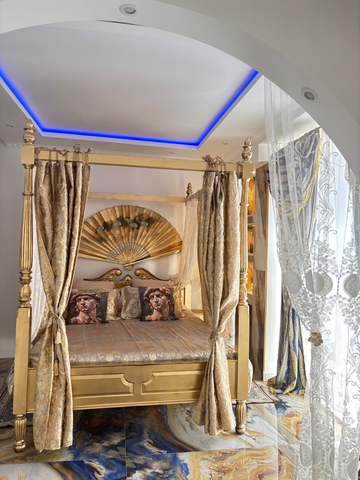 „Kényeztesd magad egy romantikus kiruccanással egy 65 négyzetméteres loftlakásban, szaunával és balneoterápiával, hogy ellazítsd a tested és megnyugtasd az elmédet. A terasz és a privát terasz arra invitál, hogy élvezd a pillanatot, míg a szabadtéri baldachinos ágy szunyókálást és éjszakákat ígér a csillagok alatt. Közös hozzáférés a medencéhez, magánszféra megőrzése. Előtted a sziklás hegy lelepleződik, a kabócák elaltatva. A varázslat működik, az idő megáll ebben a szeretetgubóban.”