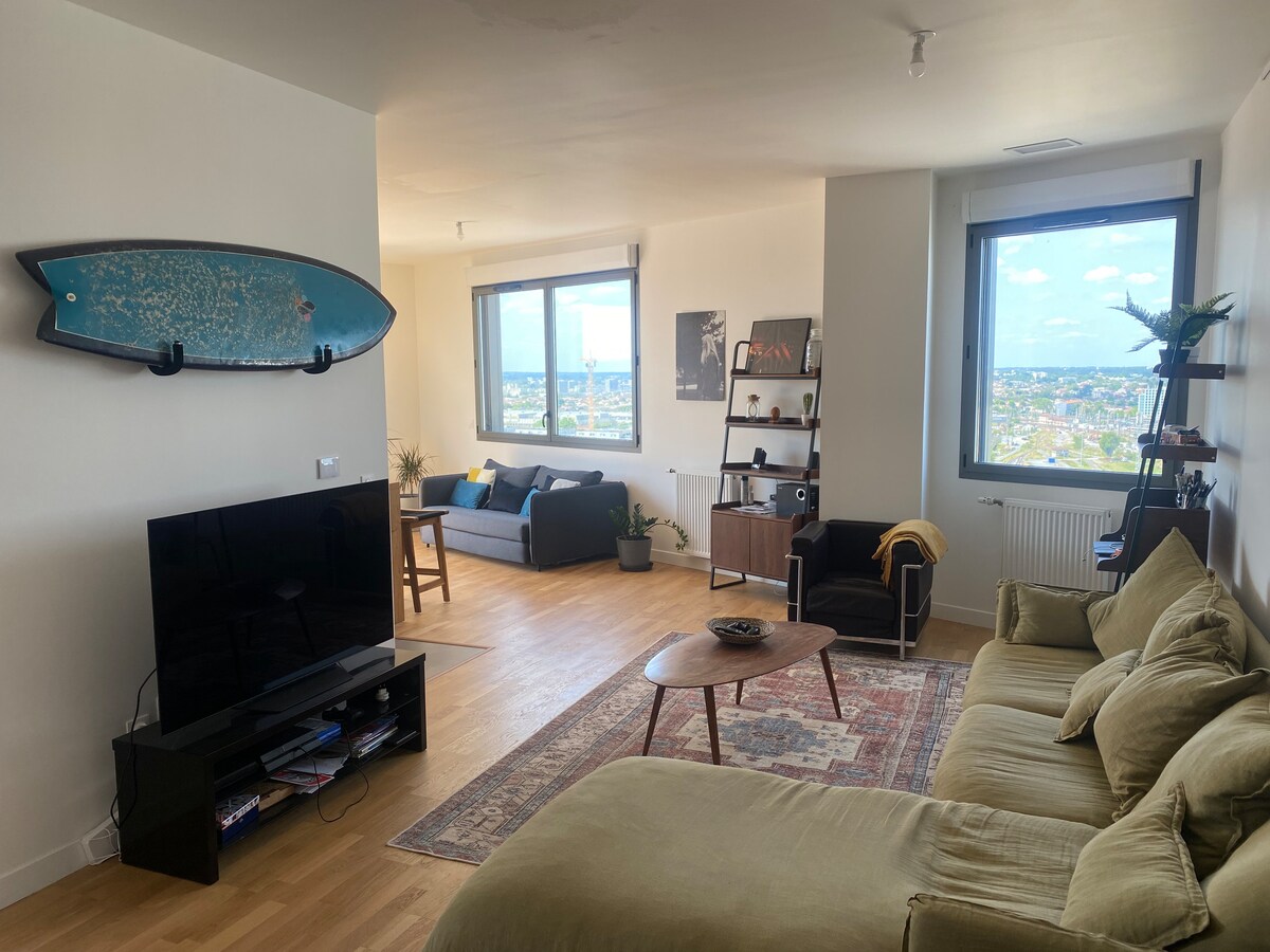 Érezd jól magad ebben a csendes és biztonságos lakásban. Egy tekintélyes bordeaux-i épület 16. emeletén található. 2 nagy hálószobából áll. Kommunikációs erkély és saját fürdőszoba. A teljesen felszerelt konyha egy 40 m2-es élettérre nyílik, amely a 20 m2-es teraszra néz, kivételes panorámával. Az Apt a villamos és az üzletek közelében található. 4 fő elszállásolására alkalmas, és minden szükséges kényelmet biztosít.