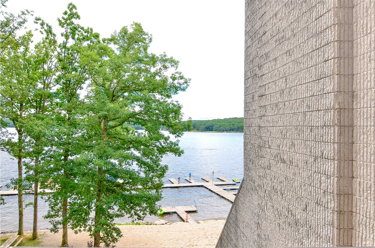 Lakefront one-bedroom, one-bath condo with private patio and wood fireplace. (Elevator access included) Hotel amenities available to all guests: Indoor pool and split-level whirlpool hot tub, two onsite dining locations, 240' of sandy beachfront and docks, fitness center, game room, racquetball court, covered parking, free WIFI, and a lakefront view with every room!