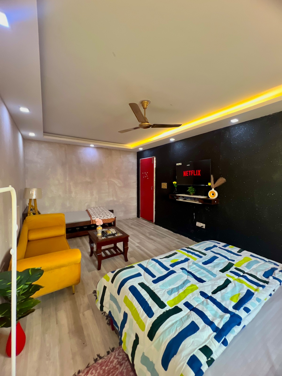 Lépj be a City of Stars✨ varázslatos világába, ahol minden este olyan, mint egy film. Merülj el a luxus pezsgőfürdőben, élvezd a privát tábortüzet és a grillezést, és nézz filmeket a nagyképernyős projektoron a csillagfényes mennyezet alatt. A Sarvodaya Enclave előkelő utcáiban elrejtőzve ez a szállás teljes magánéletet, elit biztonságot és akár 6 vendégnek is helyet kínál. Tökéletes pároknak és álmodozóknak – nem csak egy szállás, hanem egy felejthetetlen élmény.