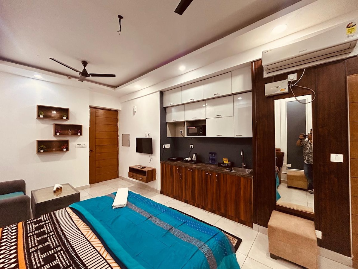 Prémium 1BHK apartman Gurgaon 43-as szektorában, légkondicionálóval a nappaliban és a hálószobában, valamint egy indukciós tűzhellyel, mikrohullámú sütővel és evőeszközökkel felszerelt konyhasarokkal. Elegáns környéken, sétatávolságra a Gold Souk Mall és a Shalom Hills School, 2,2 km-re a Millennium City Centre metrótól és 2,1 km-re a Fortis kórháztól. Külföldi vendégeket is szívesen látunk. A korai érkezés a szabad időpontok függvényében lehetséges, és 500 rúpiát kell fizetni érte, csakúgy, mint a késői távozásért, amely után minden további 3 óra 500 rúpiát jelent.