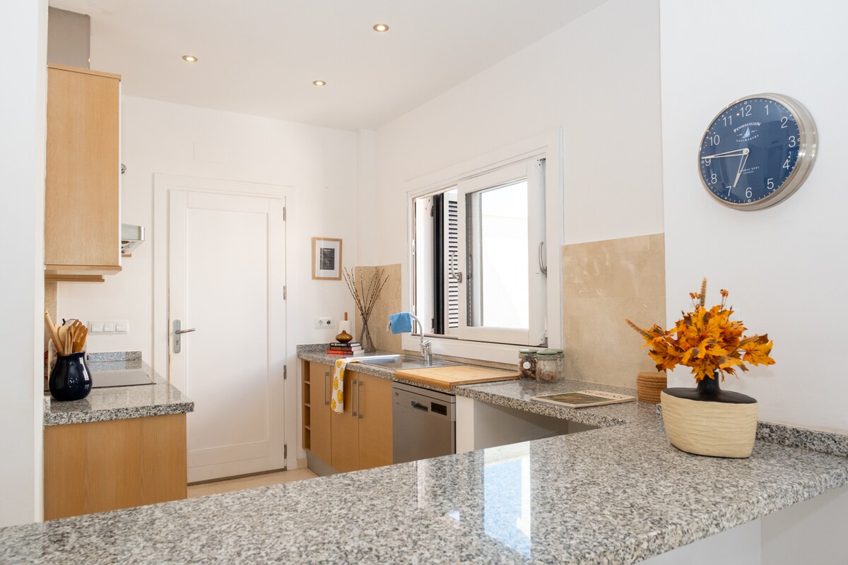 Napfényes kiruccanás a Casa Sofinatában – teraszos apartman medencével és kilátással a golfpályára a Hacienda Riquelme Resortban ✨ Világos lakás tágas terasszal a pihenéshez és a szabadtéri étkezéshez 🌴 Kilátás a medencére és a golfpályára a teraszról 🍽️ Teljesen felszerelt konyha (kávéfőző, mosogatógép, mosógép) 📶 Wi-Fi, okostévé és légkondicionálás 💛 Ideális pároknak és családoknak 🏡 Biztonságos üdülőhely medencékkel, étteremmel, üzlettel és játszótérrel 🌊 A strandok autóval mindössze 20 percre vannak, Murcia 15 percre