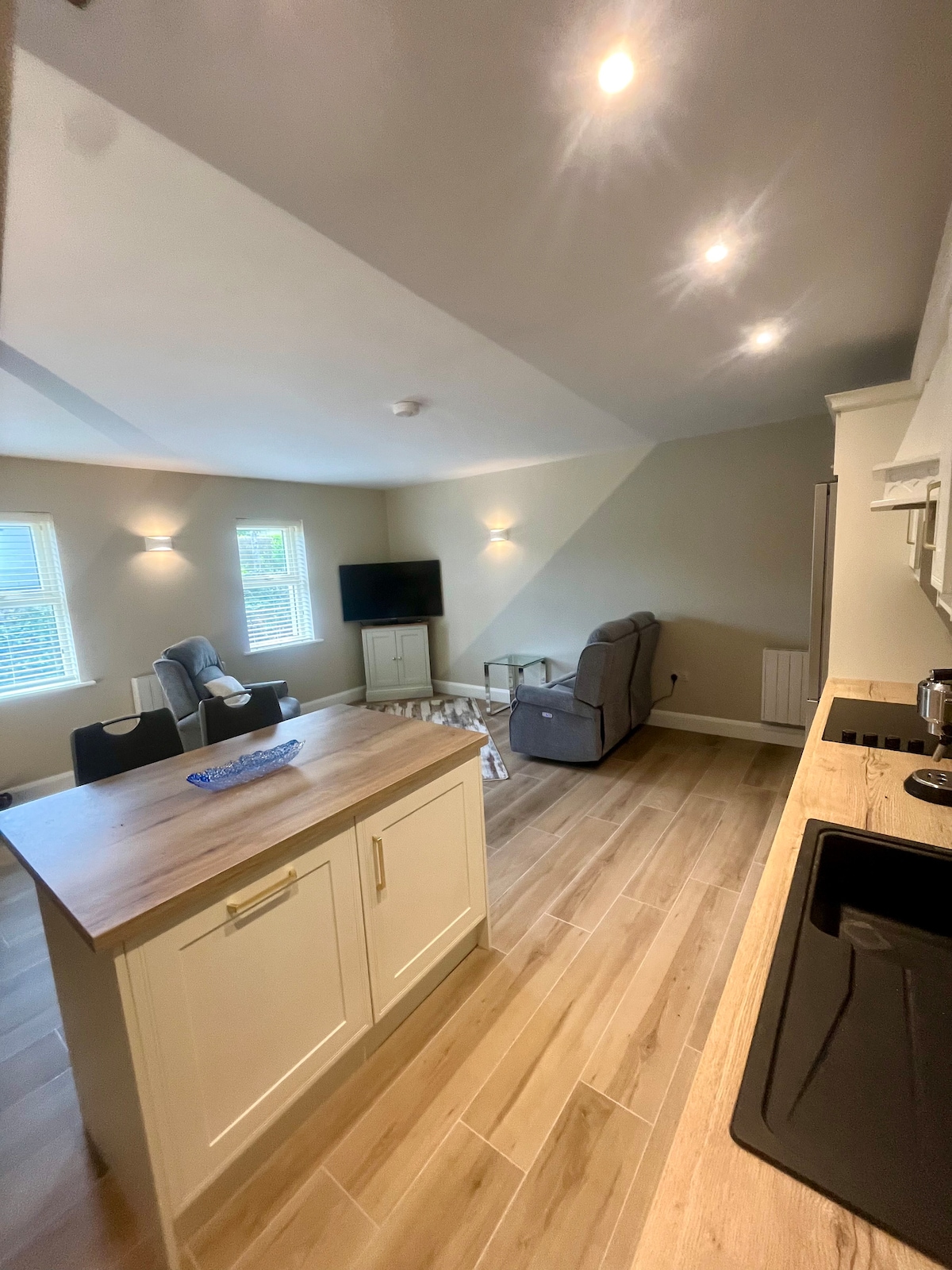 Beautiful garden annex, fully equipped with the luxury of a five star hotel but with the serenity of a retreat experience. This suite consists of three interconnecting bedrooms, kitchenette and bathroom situated in a scenic countryside setting. Large garden with lots of outdoor seating and plenty of space for kids to play football, jump on the trampoline etc. No matter what season you visit Spruce lodge it has something great to offer, be it the garden in full bloom during Summer, the gorgeous Autumnal colours of Autumn, the warm romantic Winter evenings by the open fire or the awakening of nature in Spring with the dawn chorus, you won't be disappointed.