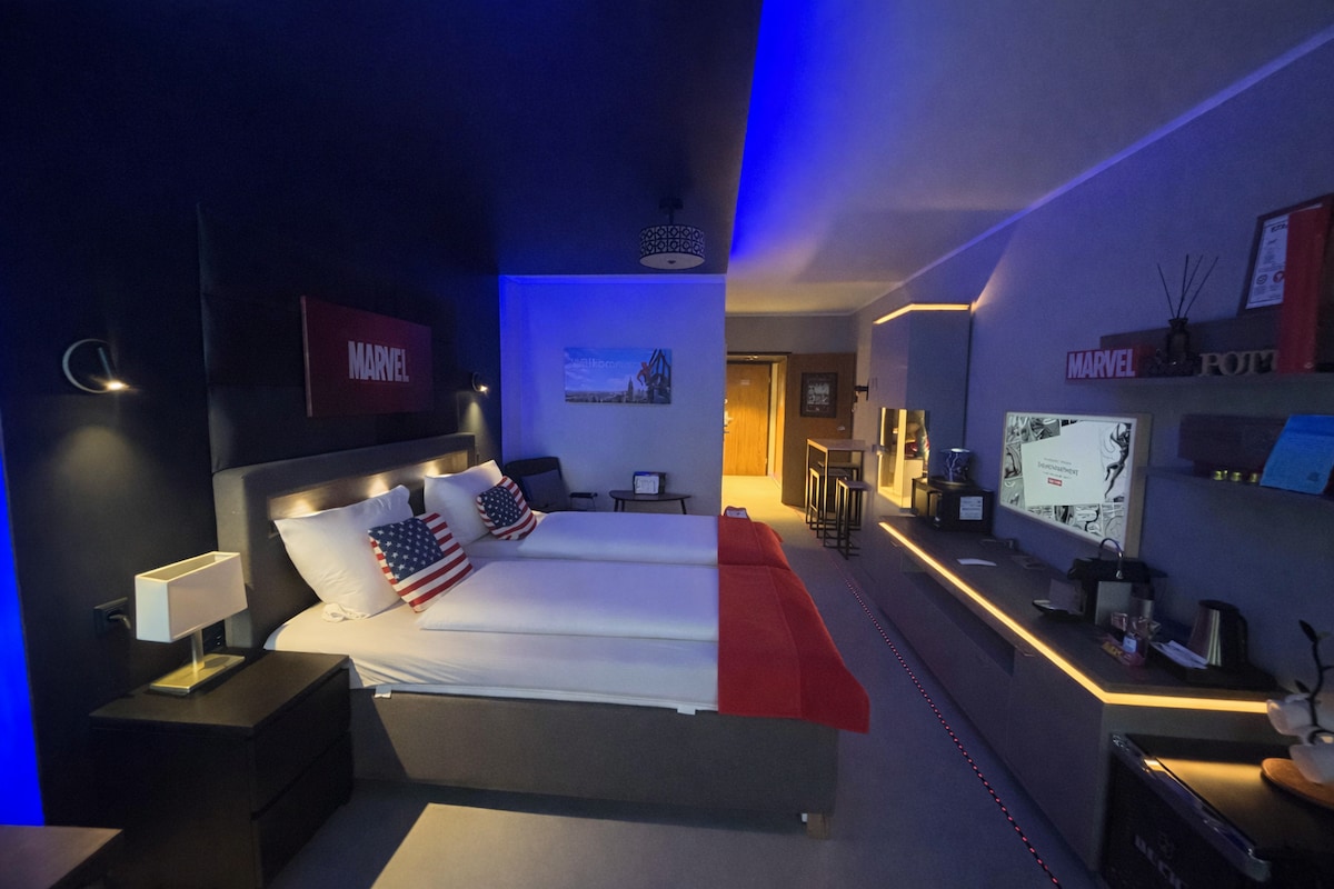 Willkommen im Themenpartment², Sie wohnen hier ganz Zentral in der nähe des HBF und der Innenstadt, modern und liebevoll themenbezogen zu der Stadt New York und Ihren Comic-Helden. Ein großes luxuriöses Boxspringbett lassen maximal 2 + 1 Erwachsene und/oder 1 Kind (Zustellbett/Klappbett) angenehm wohnen. Disney+, Handtücher, Nespresso-Maschine, Tee-Station und ein Samsung Frame gehört zur gehobenen Ausstattung bei uns dazu. Ihre Gastgeber Jacky & Kevin