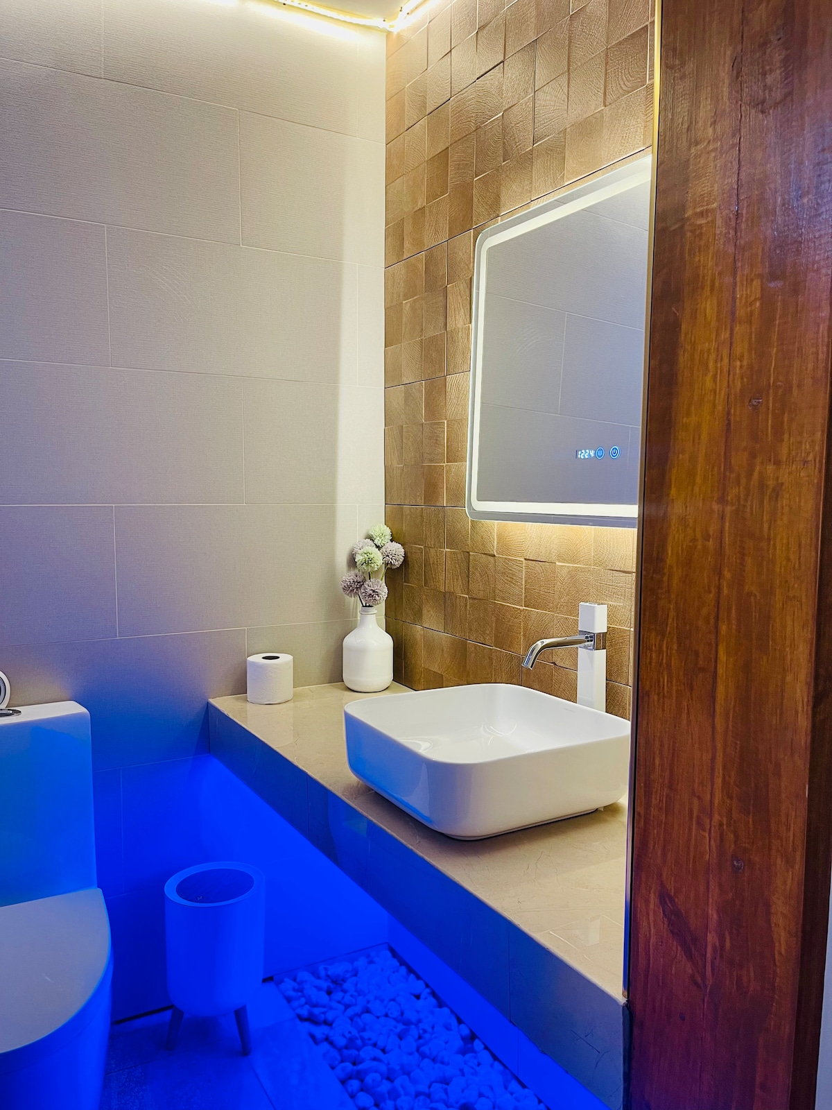 Modern, comfortable, high ceiling, spacious bathroom. Partial oceanview, floor-to-ceiling windows facing a beautiful garden, and a pathway to the outdoor kitchen. $77/night for 2 (max capacity 4) Each additional person $5 Features & Amenities 30 sqm 1 King bed + 1 Bunk bed Bathroom with Hot & Cold shower AC Free Wifi 55" Smart TV Bar fridge Outdoor Kitchen for light cooking Dining Gazebo Beachfront Gazebo