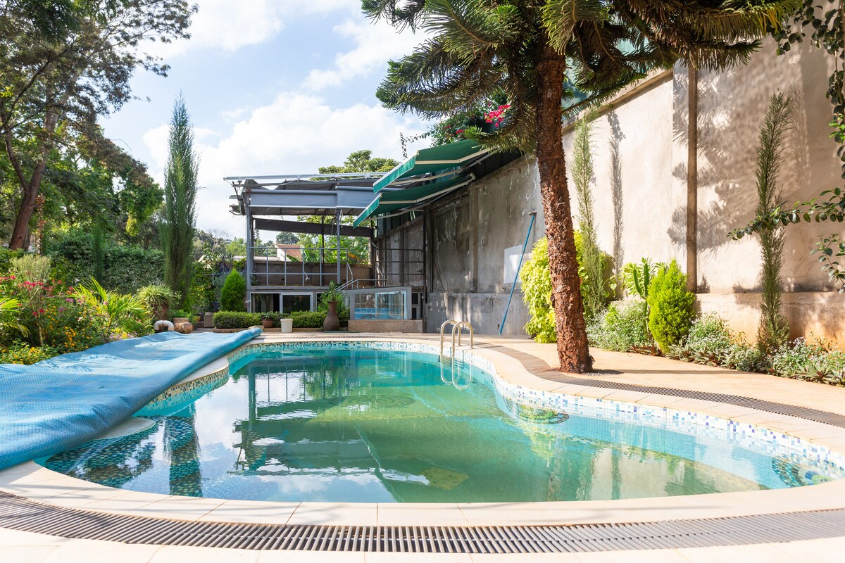Pihenj ebben a stílusos, teljesen felszerelt vendégházban, amely buja pázsittal, közös medencével és egy közeli folyóval vár. Csak 2 perc autóval és 7 perc sétára az ENSZ és az amerikai nagykövetség, valamint más nagykövetségek és éttermek. A falu piacától és a Karura erdőtől is 10 perc sétára van. Mindezek a kényelmi szolgáltatások egy biztonságos sétálóúton és egy kijelölt kerékpársávon érhetők el. Békés, központi és tele bájjal.