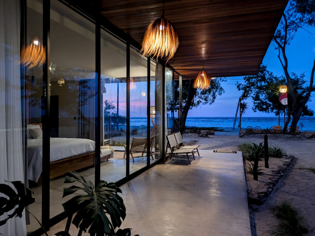 A hívogató végtelenített medence köré épült 4 bungalónk modern építészettel és tágas, padlótól a mennyezetig érő ablakokkal rendelkezik, ahonnan lélegzetelállító kilátás nyílik az óceánra és Gili Meno nyugodt tájára. A Beach Front egy 48 négyzetméteres menedékhely, amely páratlan közelséget kínál az óceánhoz, és közvetlenül a parton található, hogy lélegzetelállító kilátást és a hullámok nyugtató hangjait biztosítsa.