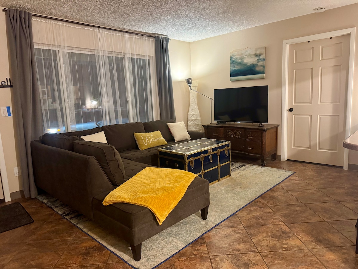 Hangulatos, alacsonyabb szintű duplex (házigazdák fent) az O'Malley Road mellett a Flattop lábánál – családok, párok és háziállatok is szívesen látottak (add hozzá a háziállatokat a foglalásodhoz). 20 percre vagy Anchorage belvárosától és a repülőtértől, és 5 percre a helyi túraútvonalak kezdetétől. Belül: hálószoba franciaággyal, kihúzható kanapé, teljes konyha, fürdőszoba, gyors Wi-Fi, mosógép/szárítógép. Egész évben áztathatod magad a pezsgőfürdőben (fürdőköpeny/törölköző biztosított), élvezheted a nem utcai parkolást és a számbillentyűs bejelentkezést. Töltsd le az Airbnb alkalmazást az egyszerű üzenetküldés érdekében.