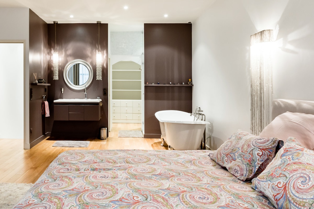 Üdvözlünk kivételes, több mint 300 m² -es loftlakásunkban, amely a párizsi Latin negyed közelében található. A földszinten élvezheted a több mint 150 m² -es, több mint 5 méter mennyezetmagasságú látványos nappalit. Ez a hely egy nagy, 8 fős étkezővel, egy nyitott konyhával és egy bárral, egy másik TV-szobával és egy szabadtéri terasszal rendelkezik. Mindent egyedi dizájn egészít ki, amelyet magával ragadó műalkotások és csúcskategóriás bútorok vesznek körül.