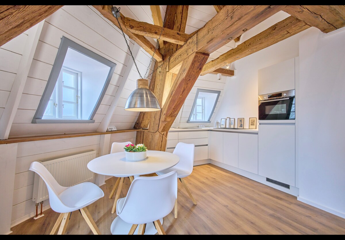 Hagyd, hogy a kilátás Flensburg háztetőin kóboroljon! Lenyűgöző fagerendák húzódnak ennek a lenyűgöző, 80 négyzetméteres lakásnak a három szintjén. Két hálószoba, egy zuhanyzó, egy nagy lakószint a 80 négyzetméteres holland galériához való hozzáféréssel, valamint egy, a nappalira néző galéria elegendő helyet biztosít. Fedezd fel Flensburg belvárosát, fedezd fel a Balti-tenger partvidékének homokos strandjait és kerékpárútjait, vagy utazz el a közeli Dániába.