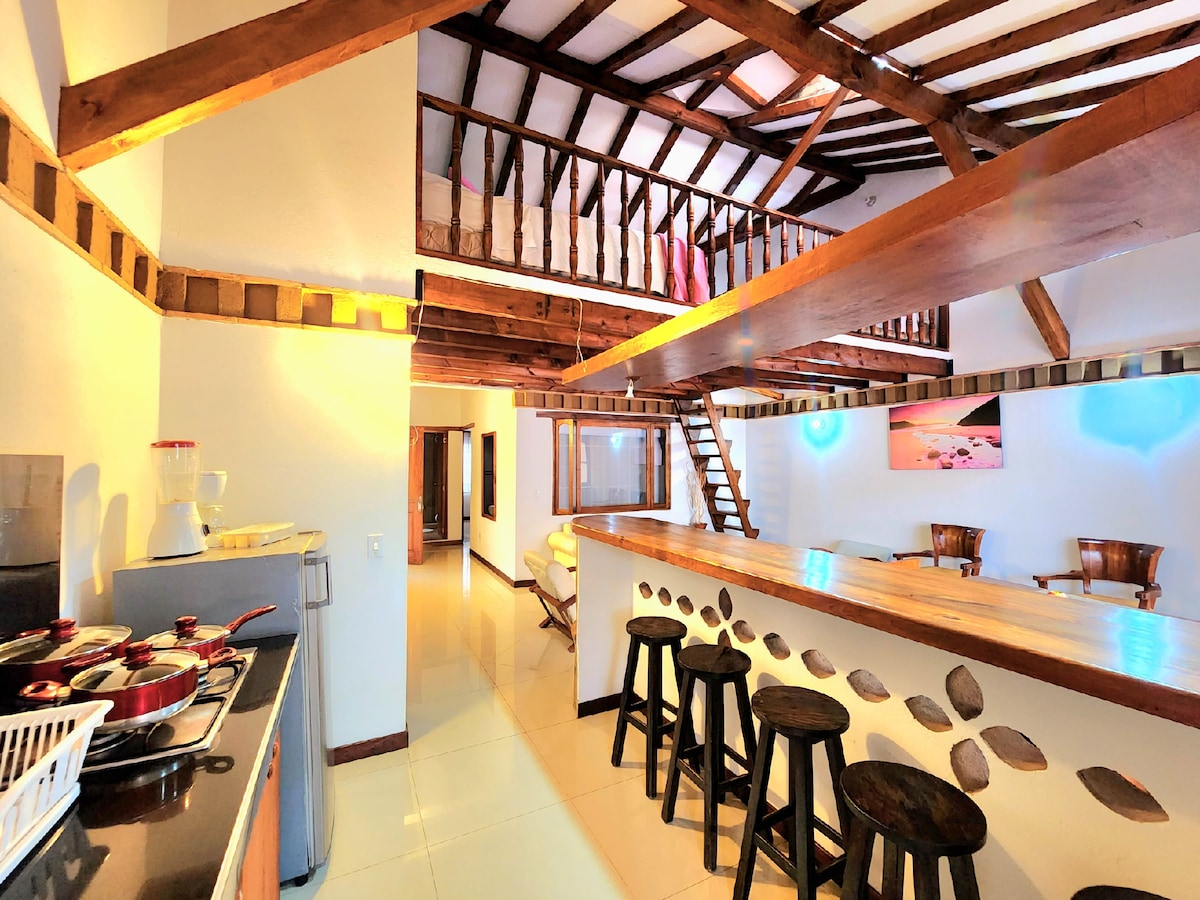 Lakás mindössze fél háztömbnyire Villa de Leyva Plaza Mayorától. Ez egy 2 hálószobás lakás, mindegyik king méretű ággyal és egy tetőtérrel, amelyben 1 kétszemélyes ágy van. 2 fürdőszoba és felszerelt konyha. Nagyon jó a világítása és a szellőzése. Tágas közösségi területek, gyönyörű erkély, és egy gyönyörű kertekkel rendelkező apartmanházban található. Könnyen megközelíthetők Villa de Leyva főbb látnivalói. Meleg víz, Wi-Fi és TV. Csak családi csoportoknak, baráti társaságoknak nem.