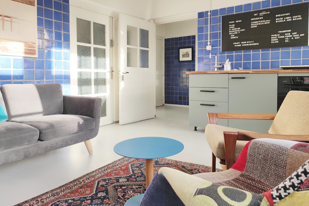 Privát lakás két nagy hálószobával, king méretű ággyal és saját fürdőszobával. A szobák között van egy nappali. Amszterdam északi részén, egy korábbi nyilvános fürdőházban található. Közel az NDSM rakparthoz. A városközpont könnyen megközelíthető tömegközlekedéssel a 35-ös busszal/52-es metróval (15 perc) vagy kerékpárral és komppal (bérelhető). Már nagyon várjuk, hogy üdvözölhessünk egyedi helyünkön