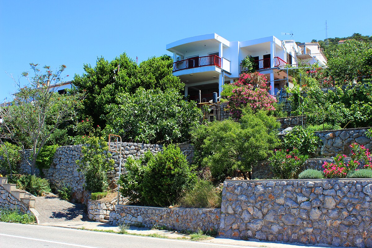 Teljesen újonnan berendezett apartman egy mediterrán növényzettel körülvett, szabadon álló házban. Első sor a tengerhez, magasságkülönbség kb. 10 m. A sziklás strandhoz kő lépcsők vezetnek le. Szenzációs kilátás nyílik a tengerre, a szigetekre, a naplementére minden szobából. Az első kavicsos strand és étterem körülbelül 50 méterre van, a város pedig, amely minden városi szolgáltatással rendelkezik, 2,5 km-re. Ebből 2 km sétány a tengerparton.